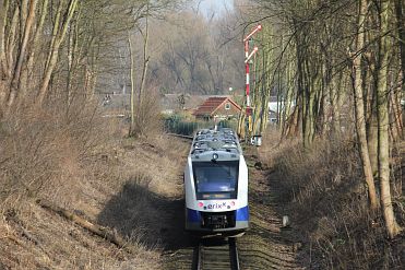 | Herbststimmung bei Bechtsbüttel: 622 209 und 622 224 haben als erx 82751 gerade die Mittellandkanalbrücke überquert und rollen jetzt das Gefälle Richtung Wenden-Bechtsbüttel hinab (30.10.16). | Tiefer Winter am 17.01.16 in Gliesmarode: erx 82747 (622 224 und 622 223) hält auf dem Weg Richtung Braunschweig Hbf hier planmäßig um 8:47. | |